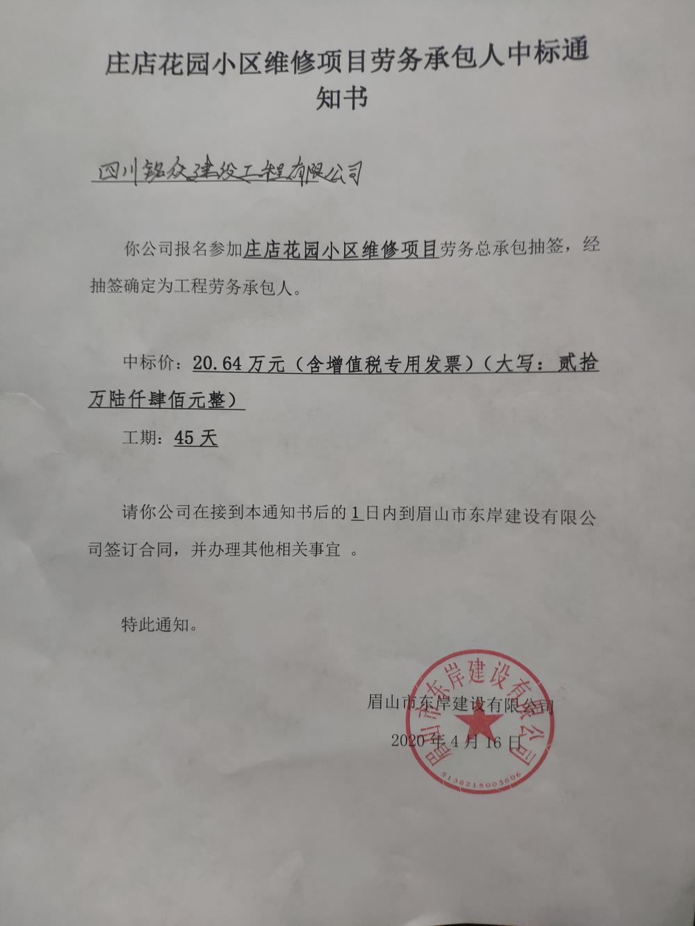 莊店花園小區(qū)維修項目中標通知