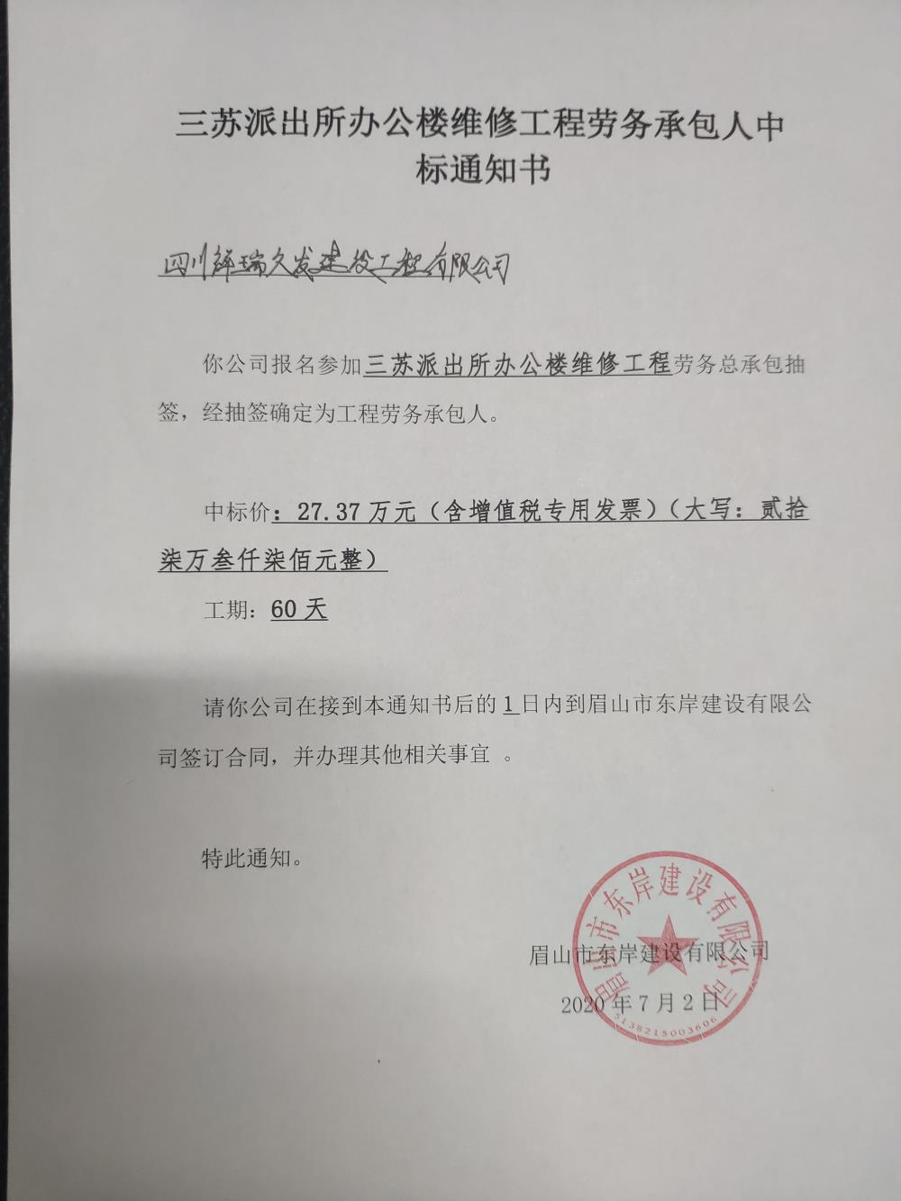 三蘇派出所辦公樓維修工程和崇禮鎮(zhèn)幼兒園建設(shè)項(xiàng)目室內(nèi)裝飾工程中標(biāo)通知